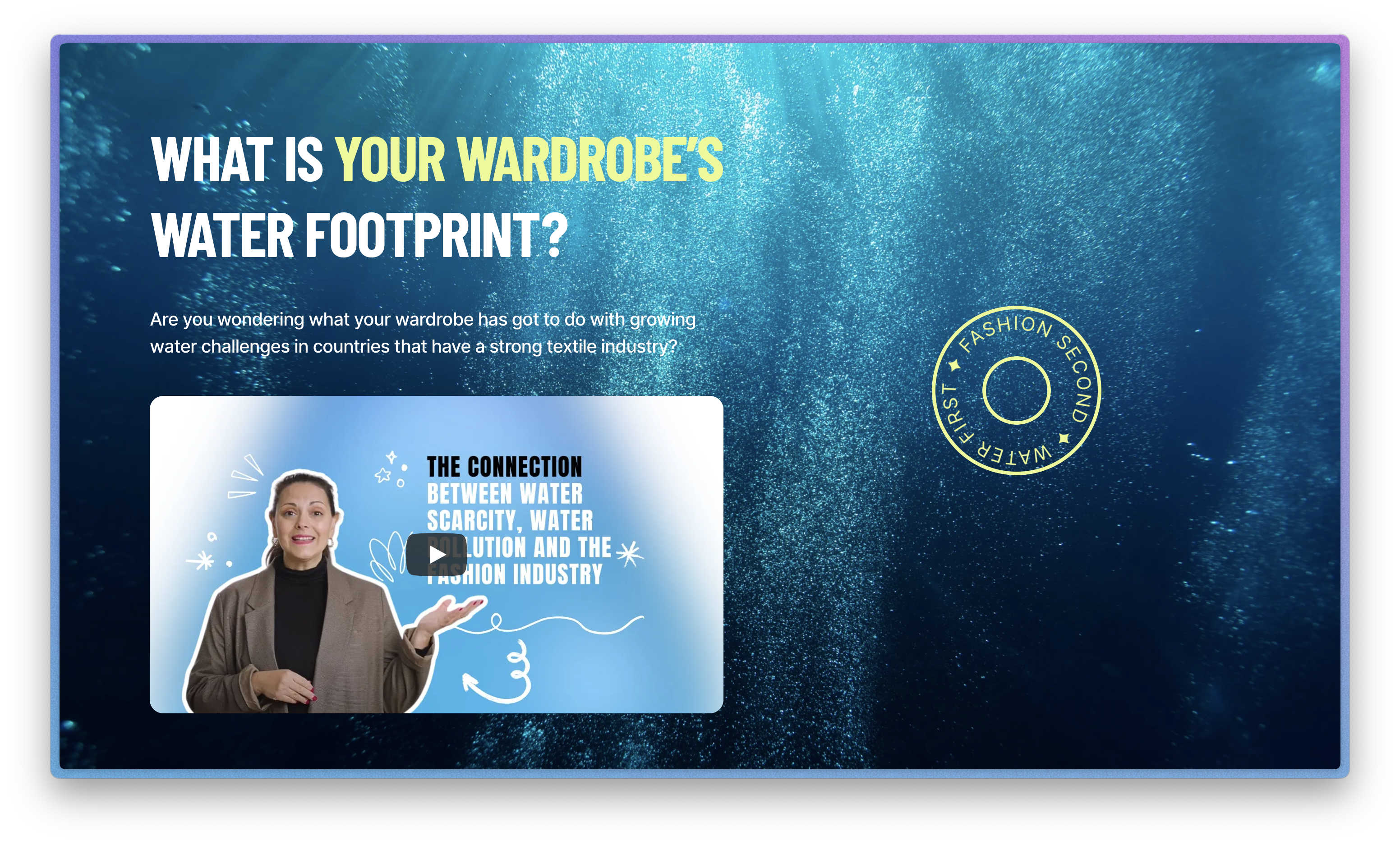 We have developed a simple online tool called the WATER PLAYBOOK to inform people about the connection between water and fashion. The tool includes an easy-to-use water calculator that helps you understand the impact of your fashion consumption habits on global water resources. We invite everyone to test the tool and spread the word! Currently, we are developing new versions of the tool specifically for brands and students to support our school workshops.