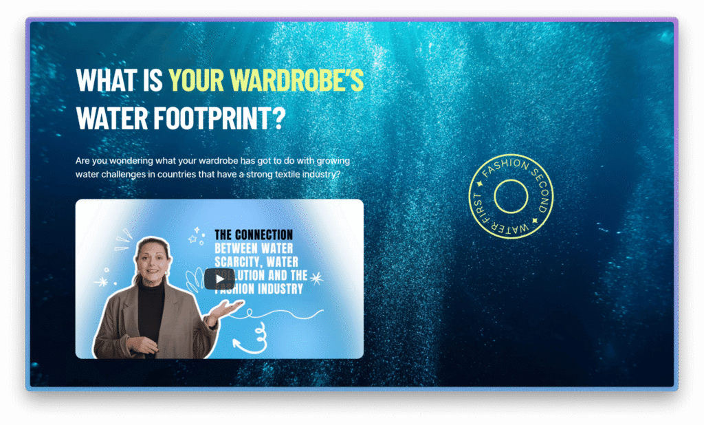 Das Water Playbook ist eine interaktive Bildungsplattform in 3 unterschiedlichen Ausführungen für Schüler*innen, Konsument*innen und Unternehmen. Darin findest du spannende Erklärvideos, einen Wasserfußabdruckrechner und anschauliche Texte und Grafiken. Entdecke, wie die textile Lieferkette funktioniert, welche Rolle verschiedene Materialien spielen, warum Wassergerechtigkeit und das Menschenrecht auf Wasser wichtig sind und erhalte praktische Tipps für einen nachhaltigeren Konsum.