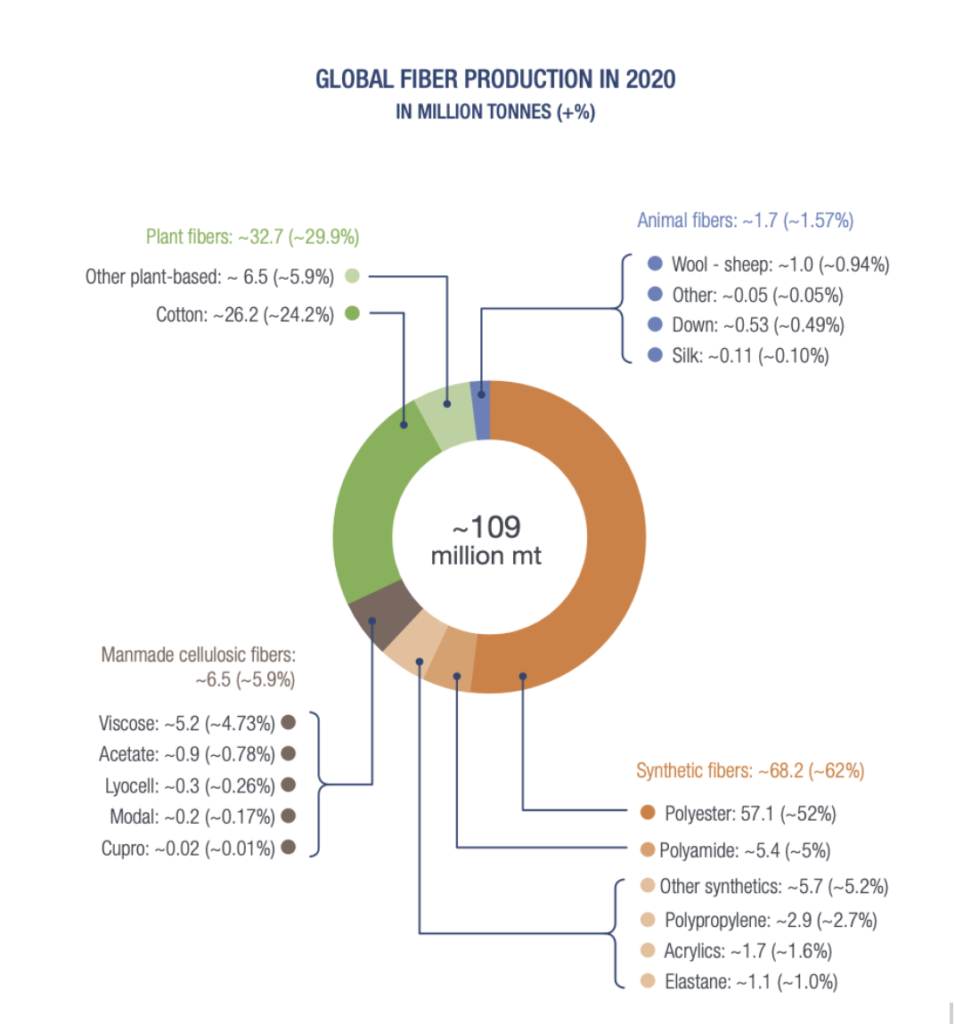 In 2020, the global fibre production of synthetic fibres reached approximately 68.2 million tonnes (mt), making up approximately 62% of the market share for global fibre production. Figure 1 below illustrates the breakdown of this production, revealing that 57.1mt out of 68.2mt of polyester fibre was produced. The subsequent production quantities also included polyamide, other synthetics, polyamide, polypropylene, acrylics, and elastane. Figure 1: Global Fibre Production in 2020 in million tonnes (+%). Source: Textile Exchange, 2021.